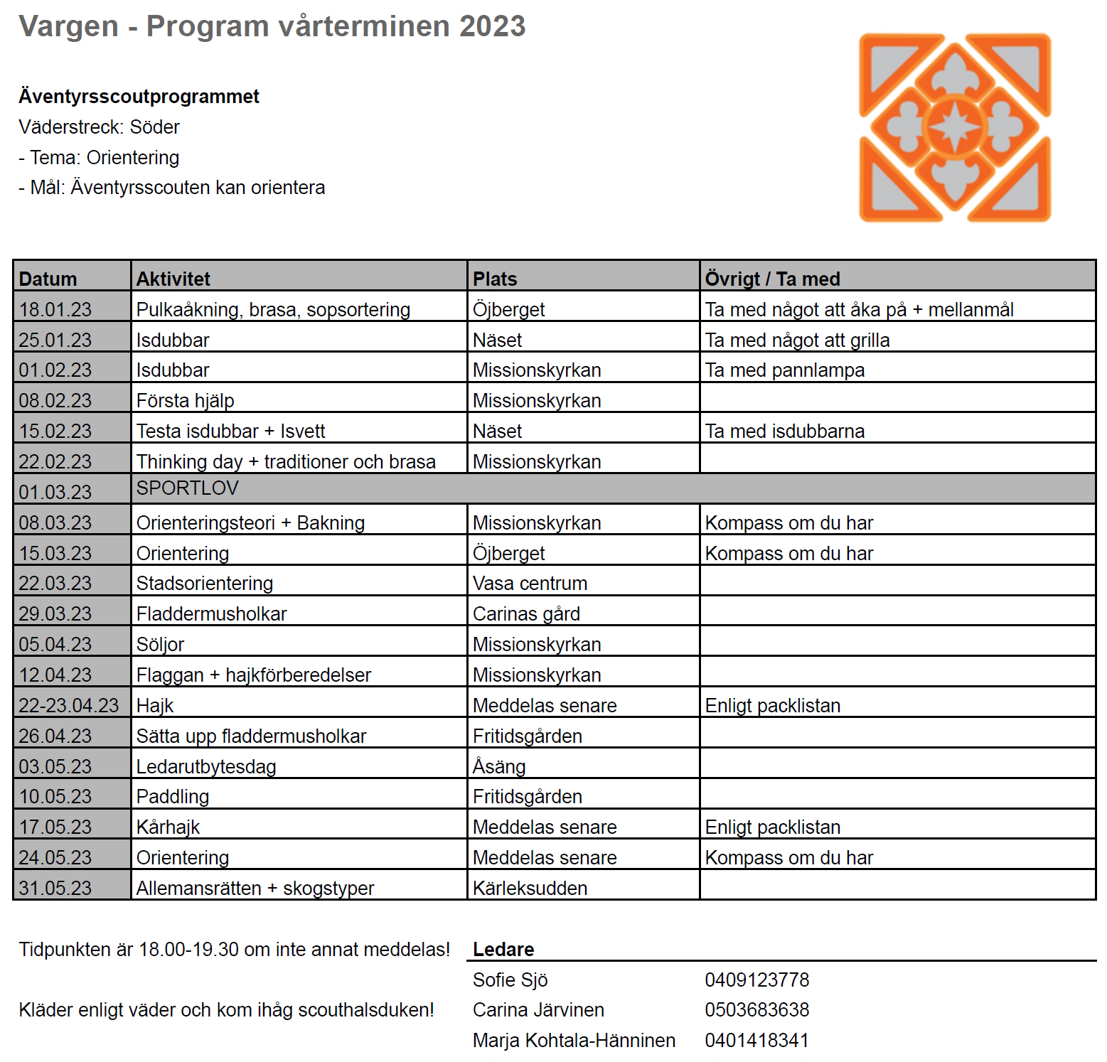 Vargen är vår patrull för flickor i årskurs 7. Patrullen består av 5 spejarscouter och ledare är Sofie Sjö, Carina Järvinen samt hjälpledare Tilde Sjö.