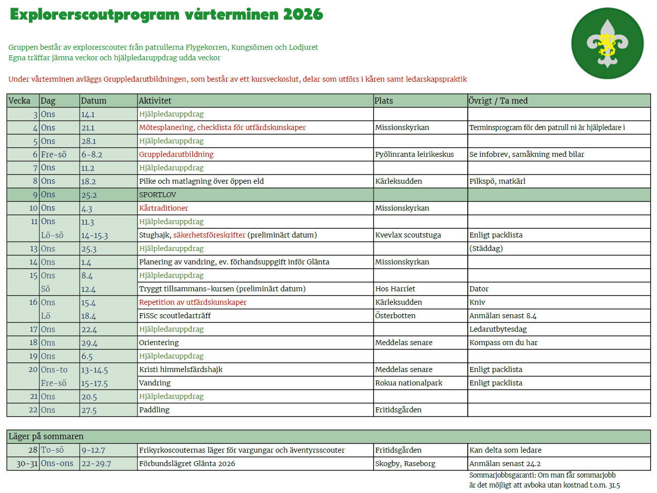 Explorerscouterna har eget program varannan vecka och fungerar som hjälpledare i yngre patruller varannan vecka.